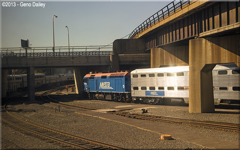 | Now turning west onto the BNSF Aurora Sub and passing a Metra train. This line is sometimes referred to as the "racetrack". |