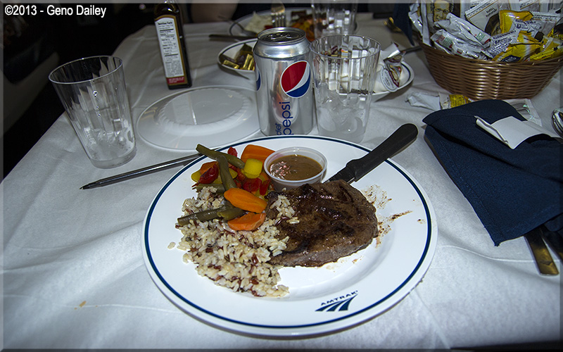 | Time for dinner!!! I had the Amtrak Signature Steak with Wild Rice and Veggies and a Diet Pepsi, good eats!!! |