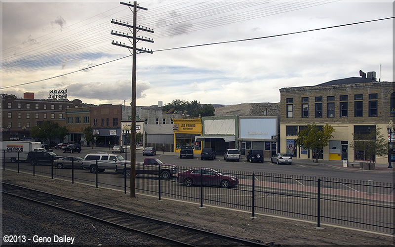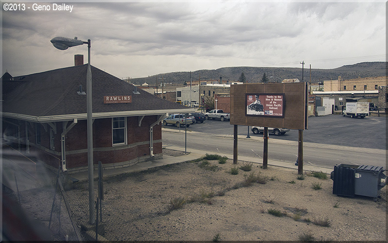 | Passing by the former Union Pacific passenger station at Rawlins with a thank-you billboard from the United Way showing a Big Boy! |