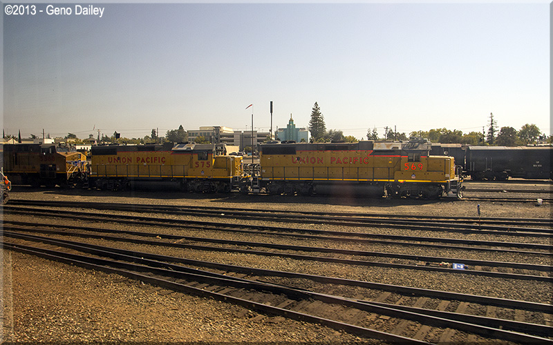 | 2 Union Pacific EMD GP60's at Roseville yard, a very impressive yard you go through just after the Roseville station stop. |