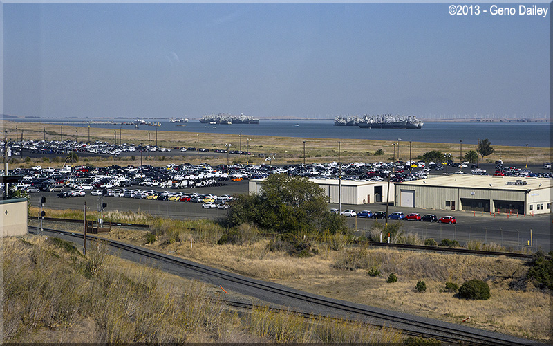 | A huge new car transload facility near Suisun Bay with the Mothball Fleet in the background. |