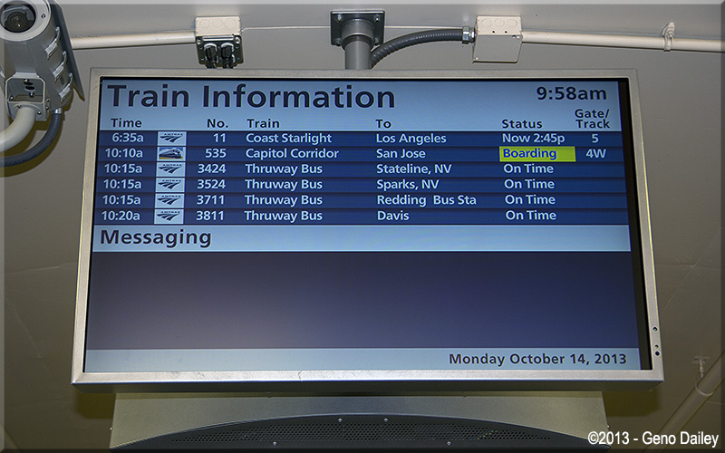 This train information board is set up in the walkway to the platforms at Sacramento. The train I would be riding today,