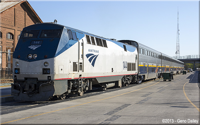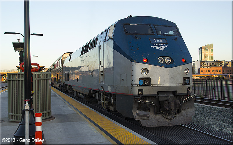 | Amtrak California Capital Corridor Train #535 with Amtrak GE P42DC #144 for power, minutes before departure. |