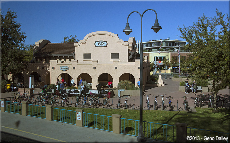 | Amtrak's station at Davis, another former Southern Pacific station. Bike riding is very popular here as evidenced by the bike racks. |