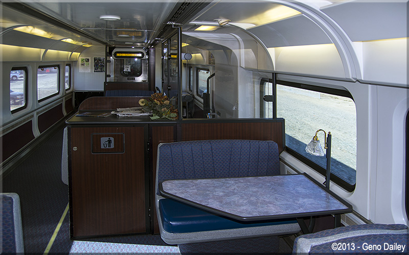 | An inside view of the Coach/Cafe car on this train, this is one of the nicest decors I've seen in my Amtrak travels! |