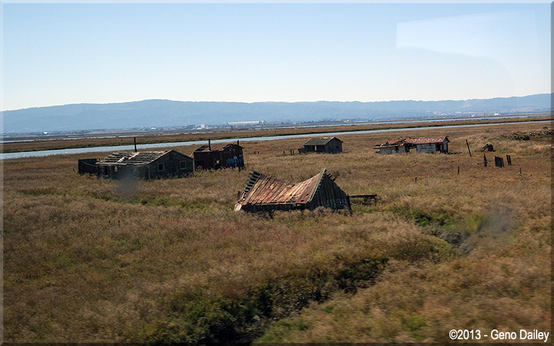 | Some old dilapidated structures at Alviso, CA. One of them towards the right of this photo has the word "wanderer" painted on the roof. |