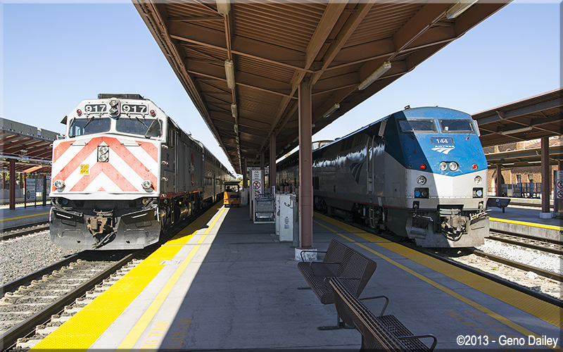 | Caltrain on the left, Amtrak California on the right at San Jose. |