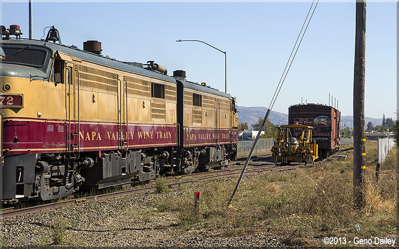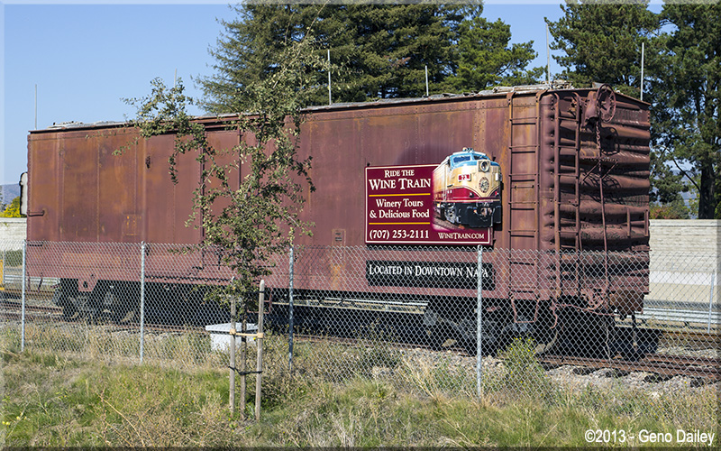 | Passing some track equipment and a box car with more billboards for the Wine Train. |