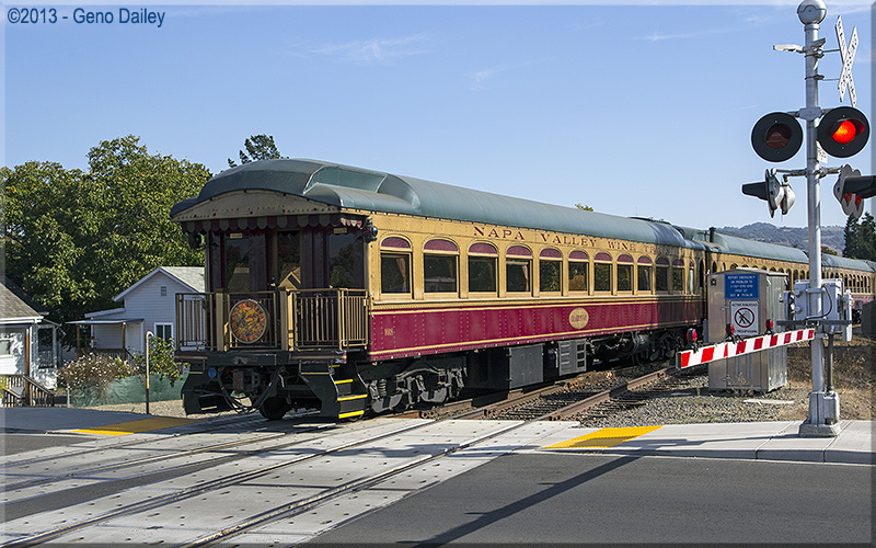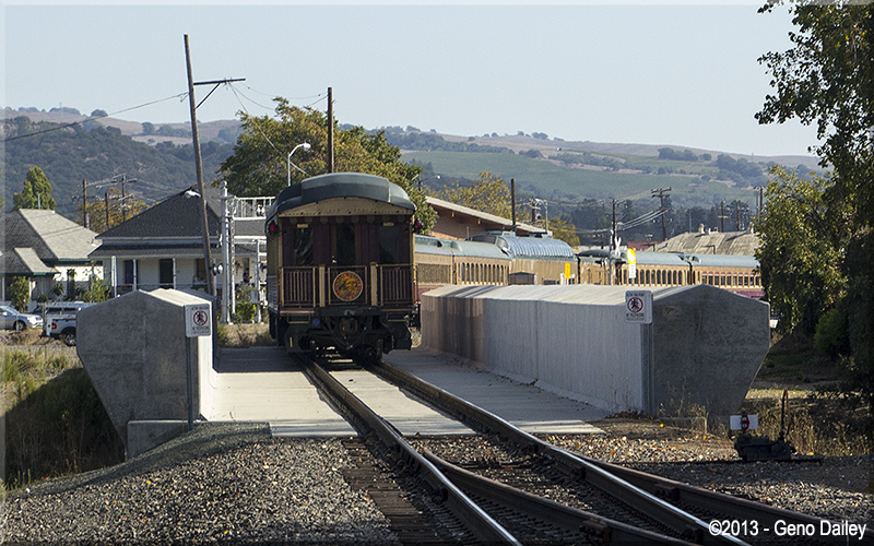 | The Chardonnay Lounge Car crossing First Street heading into the yard. |