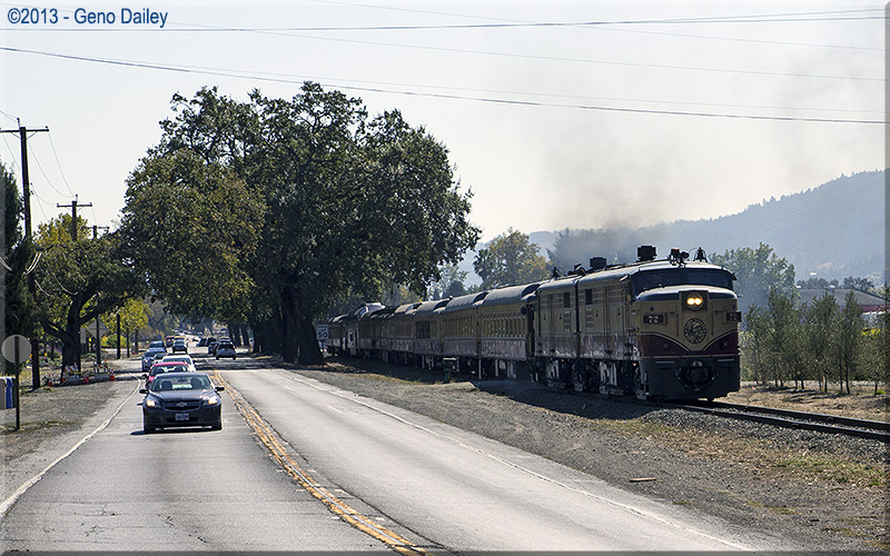 Crossing Adams Street and approaching Saint Helena Station where the train's two locomotives will now