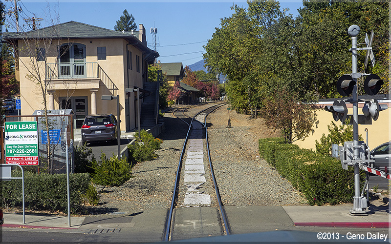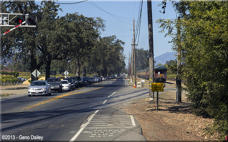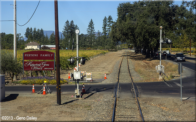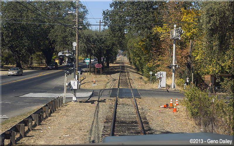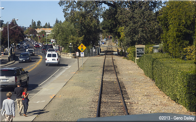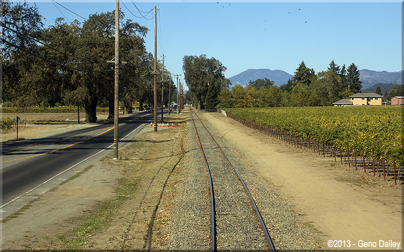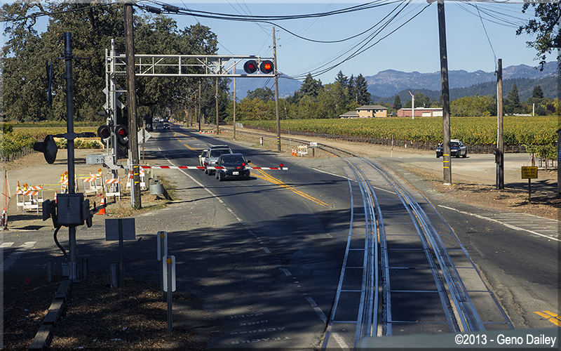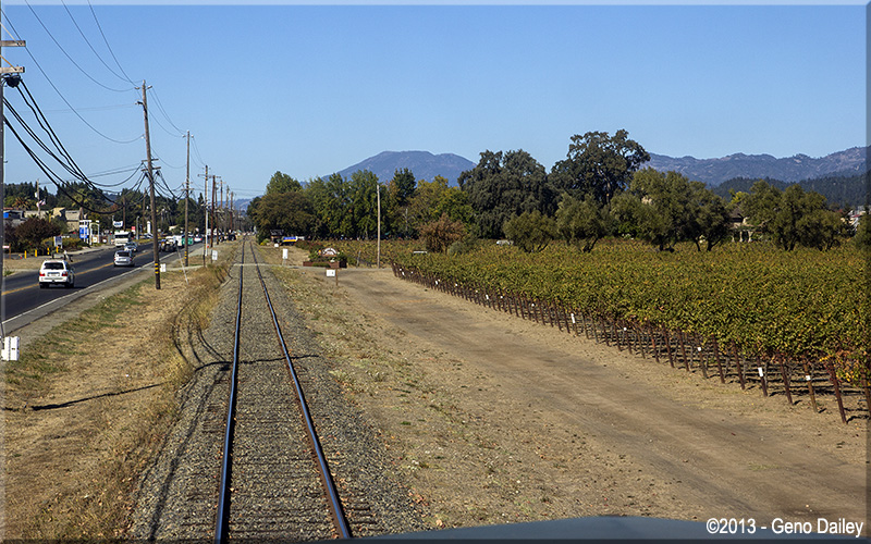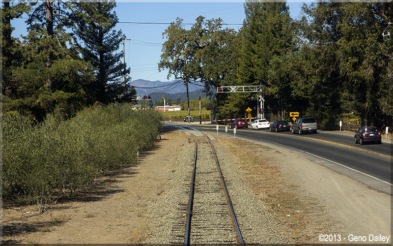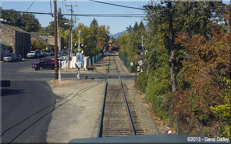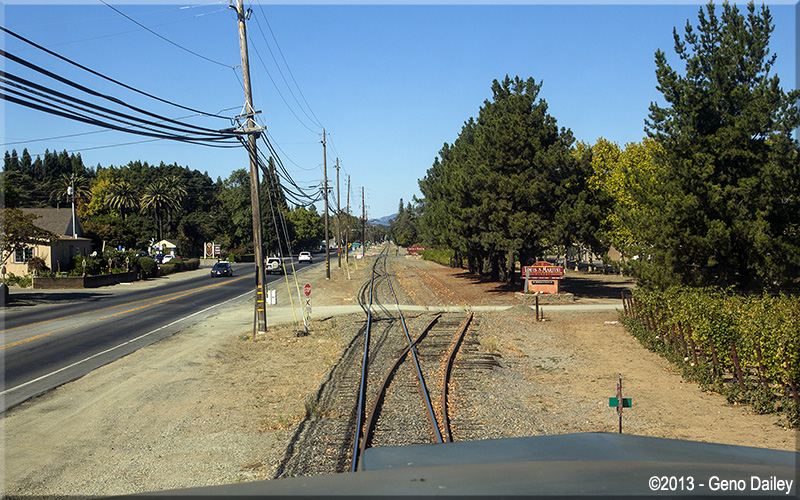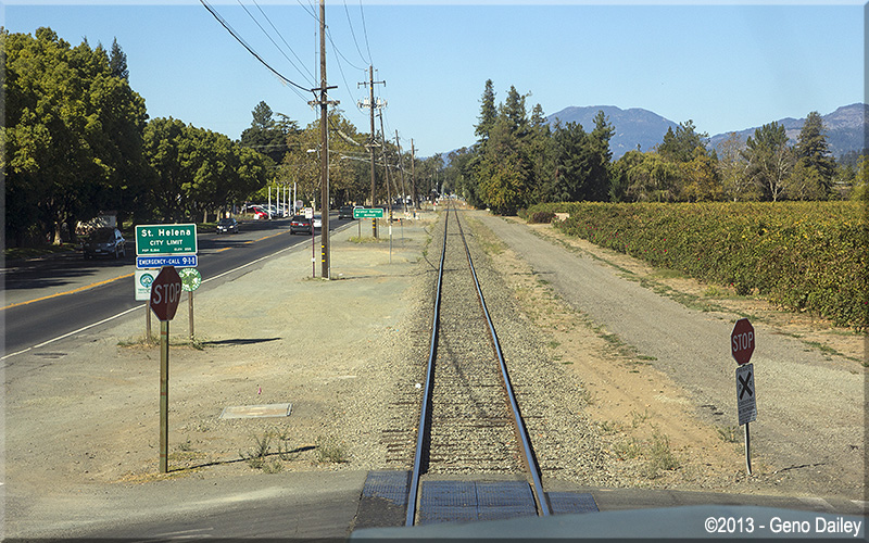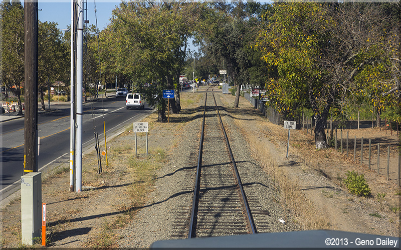 | The train will now ride on the right side of Route 29 the rest of the way to Saint Helena. |