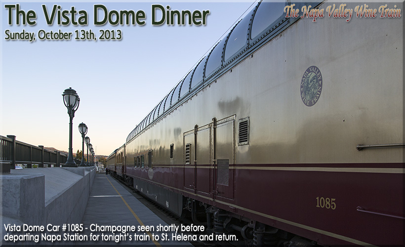 After driving back to Napa around 5:30pm, I met up with my railfan friend Andy from here on the west coast who would be riding with me on the dinner train. After checking in, the same member of the Wine Train's staff who gave the speech before we boarded the lunch train, did so for this train, then boarding would commence. We were in Boarding Group F so we were some of the last to board. Once we got on the train, it was now about sunset so photography was rather limited due to the lack of daylight, though I would photograph all of the food on both this trip and previously on the day trip (you likely already saw those photos)!