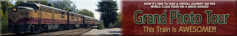 And now, I've saved the best part of this experience for last, THE PHOTOS!!! I had thought long and hard about just how to exactly display these photos and in what order I would display them. I spent a total of 3 days riding and photographing this train, in what amounted to be identical weather conditions all 3 days. The weather was nothing short of absolutely perfect (someone needs to figure out a way to funnel that beautiful weather back to New York!) the whole time I was here. Looking back, I kinda like to think of the weather here like the country song "Sunny And 75" by Joe Nichols! So with all of this, I now present to you, a MULTI-ANGLED PHOTO TOUR of the Wine Train from Napa to Saint Helena and MORE!!! I think you're gonna really like what you see, so click the link below and let the pictures be seen... |