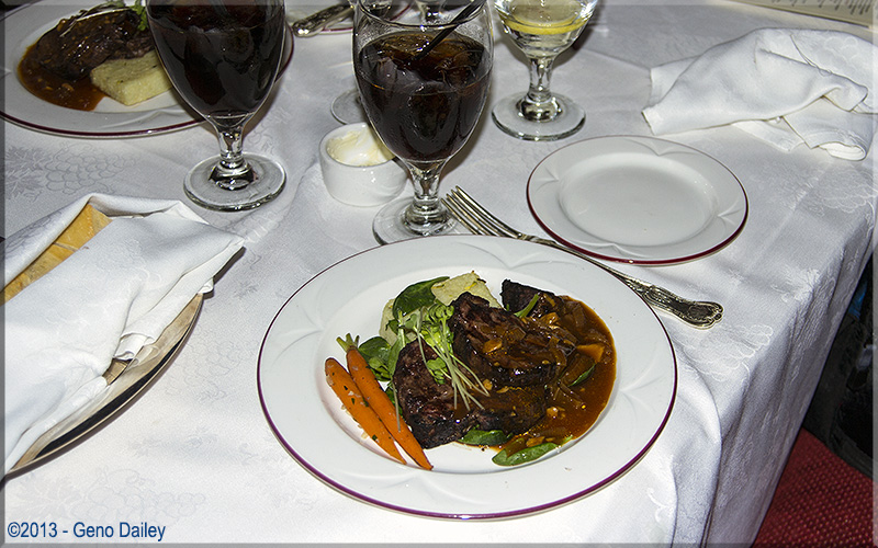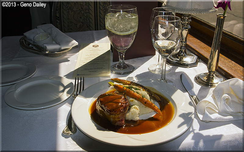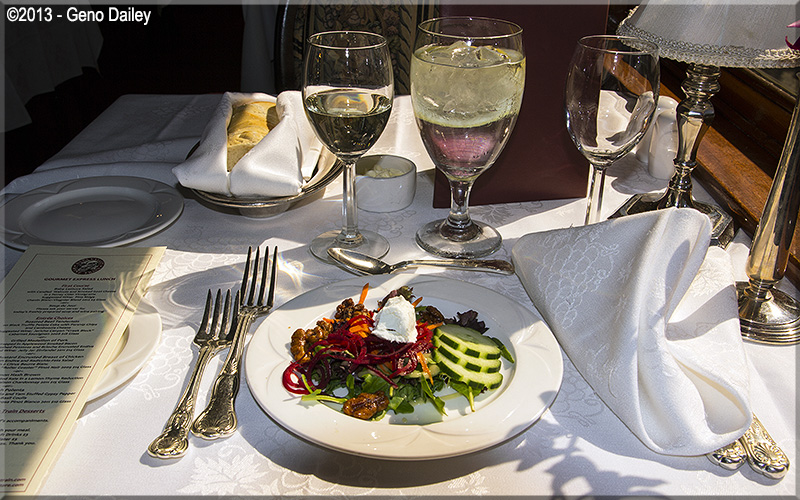 For dinner, I would ride in the Vista Dome Car! I had done this once previously on my trip here in 2011 but decided to have dinner this time to sample the dinner menu and so I could also say I ate both lunch and dinner in this car! Once again, this meal (as well as lunch before it) was absolutely world class. What you will see here are photos of menu items that I selected. There is actually a variety of food offerings on the menu along with the wine that pairs well with each selection.