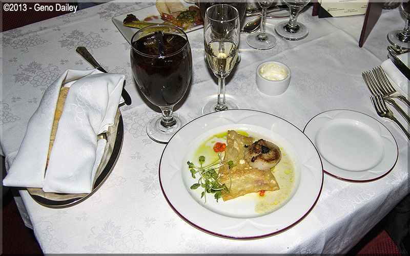 Now I'm back for dinner in the Vista Dome! To start things off, I had an Hors d'Oeuvre which was a Pan Seared Scallop in a Champagne