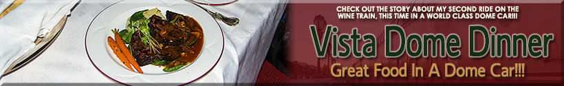 Once we departed Saint Helena, I would start my meal. Now there are multiple selections available on the menu for the different meal courses. The menu also says which wines pair best with each course should you want to have more wine! What I'm describing here is specifically what I had for lunch: The first course was a Baby Lettuce Salad with Candied Walnuts (I LOVE candied walnuts!!!) and Smoked Goat Cheese in a Honey Cider Vinaigrette! I was also given a sample of the Wine Train's own Private Label Chardonnay bottled by the Raymond Vineyard as well. My entree would be the Grilled Medallion Of Pork wrapped in Applewood Smoked Bacon on Garlic Mashed Potatoes and Brioche Encrusted Endive. For Dessert, I had a Bourbon-flavored Chocolate Brownie with Walnuts and Caramel on top, all of this with some Diet Coke (my whole purpose today was really just being on the train. If you haven't figured it out yet, I'm not much of a wine drinker). All of the food was excellent!!! The service was also top notch as well. The staff on this train provides a level of service that is absolutely world class!!! |