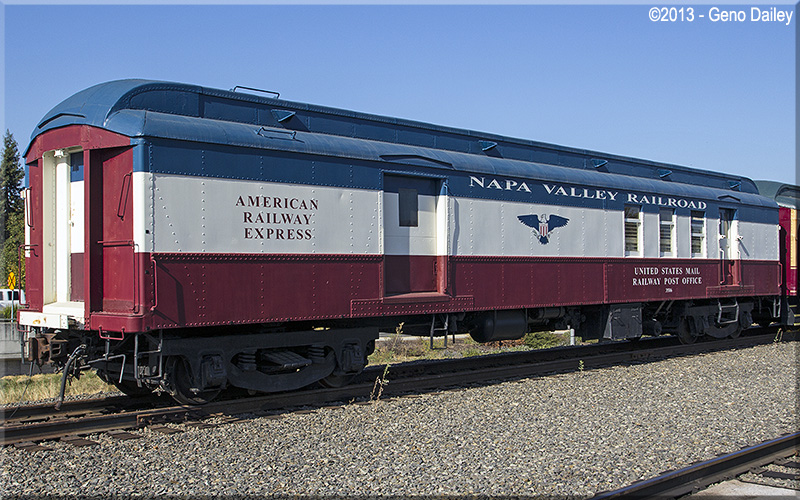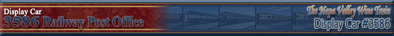 This car started its career as a United State Railway Post Office (RPO) car for the Cincinatti, New Orleans, & Texas Pacific Railway which later became part of the Southern Railway. The Napa Valley Wine Train purchased the car in 1987 with the goal of historic preservation as this car is not part of the regular wine train's consist. The car today is a fully-equipped RPO. Historical Information about this car provided by the Napa Valley Wine Train as well as the Northern Alabama Railroad Museum in Huntsville, AL who owns sister car 3585. |