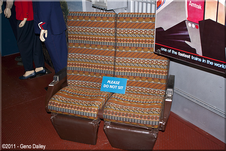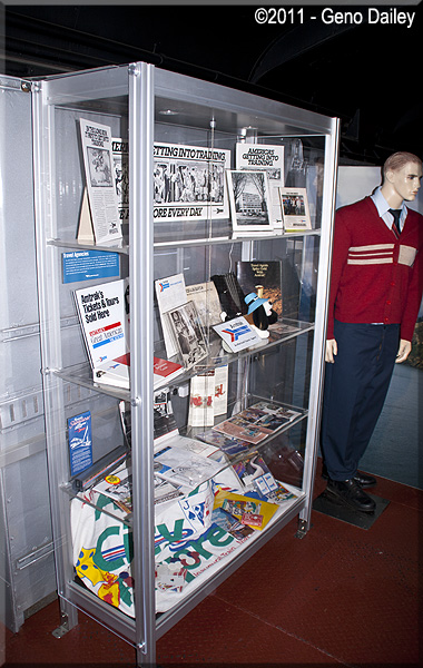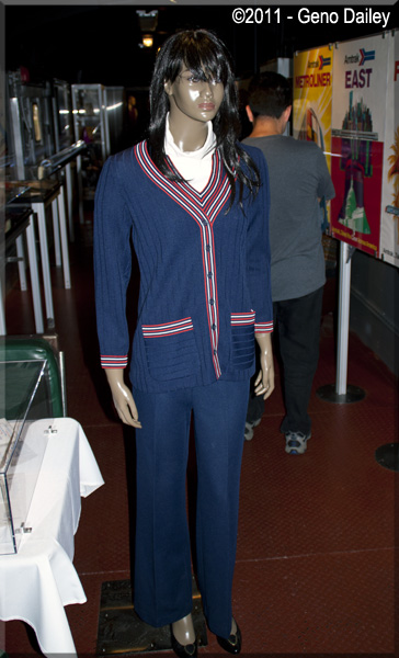 | LEFT: A display case of "All Things Amtrak". RIGHT: A 1970's era dining car uniform. |