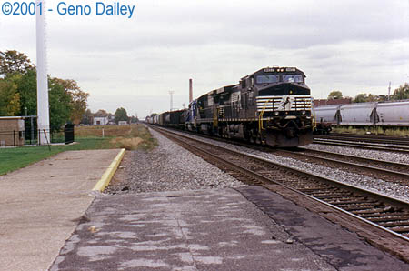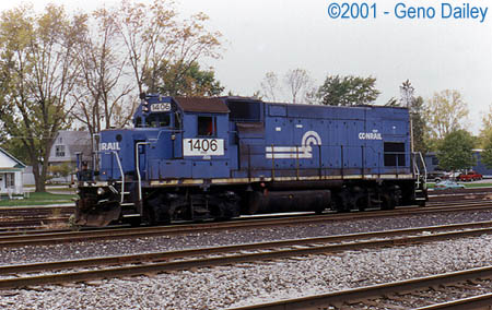 sitting in the small yard located next to the Amtrak Station and well, I thought it was rather interesting to see something like that on a freight car. Anyways, I arrived at the station and found nobody else there yet when I got there. I generally arrive early enough to get in the trainwatching, definitely the "railfan in me"! Before long, some freight action did come by, although not very much. I think its safe to say that NS doesn't run as many trains here as Conrail once did but I'm sure the slow economy doesn't help that either. Railroading is a business that definitely booms when the economy is booming, which unfortunately wasn't the case in the year 2001. Before long, the local NS Yard job showed up in Sandusky with today's power being a former Conrail GP15-1 #1406, this unit was built back in the late 1970's for Conrail by EMD using parts from older retired units. I believe the frames these units were built on were from retired GP9's.