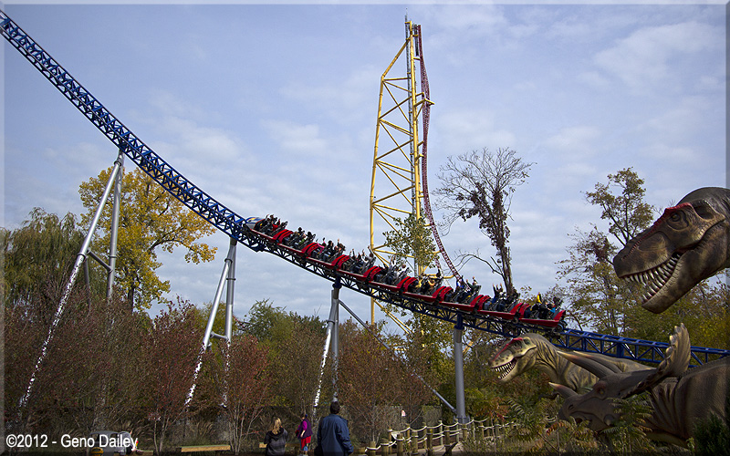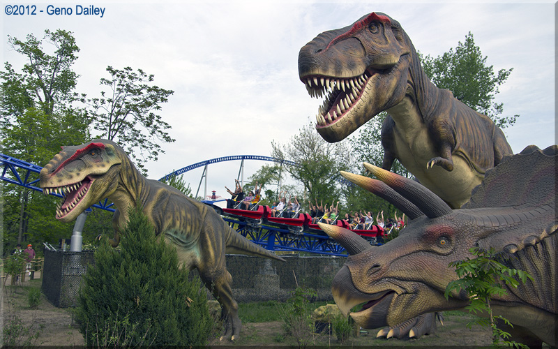 | A couple T-Rex's and a Triceratops just hanging out with Millennium Force! |