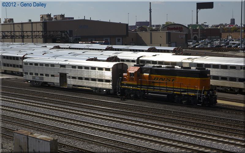 | BNSF EMD GP39-3R #2661 switches coaches in Metra's yard. | |