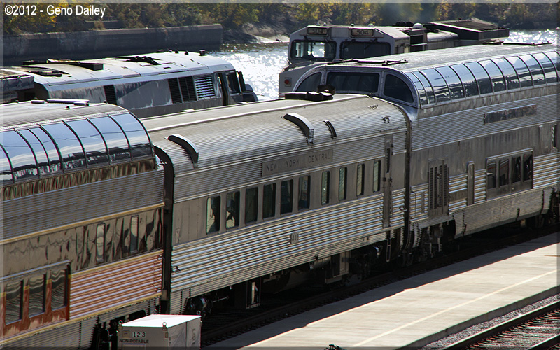 | More cars operated by Pullman Rail Journeys including 2 full-length dome cars along with former New York Central Dining Car #448 seen in the center of the above photo. |