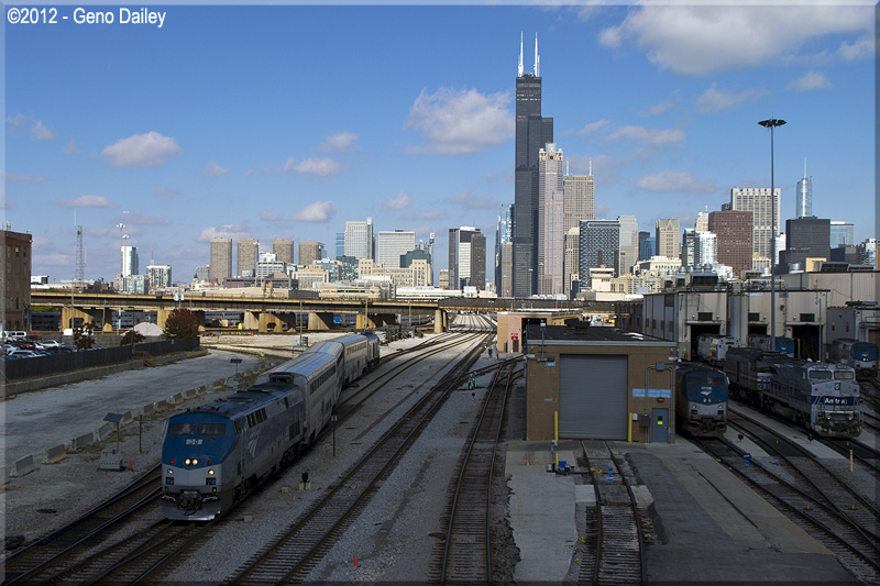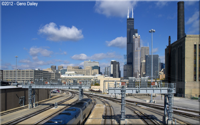 | Amtrak Train #49 (seen in the lower left-hand corner of the above photo) backs out of Chicago Union Station heading into the coach yard with the Willis Tower in the background. |