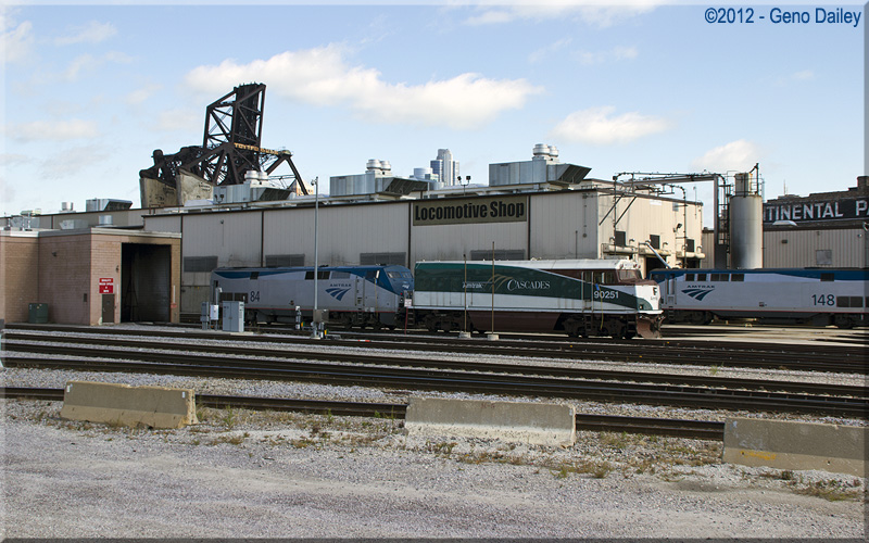| Just my luck that a cloud ducked in front of the sun when I took this photo! Here we have Amtrak Train #371 - The Pere Marquette heading into the yard for servicing, passing the Locomotive Shop facilities with P42DC #30 leading this Superliner-equipped train. Special Thanks to Trainorders.com for help in identifying this train. |