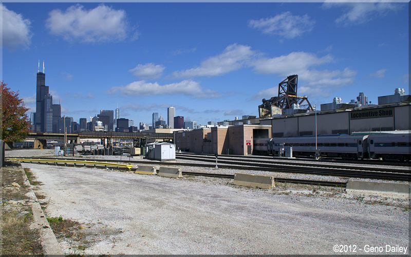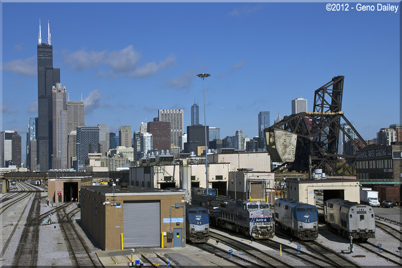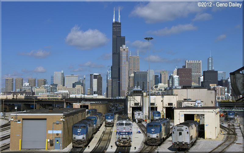 | A wide view of Amtrak power at the Chicago Locomotive Shop with the Willis Tower in the background, I love railfanning in Chicago!!! | |