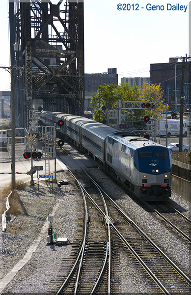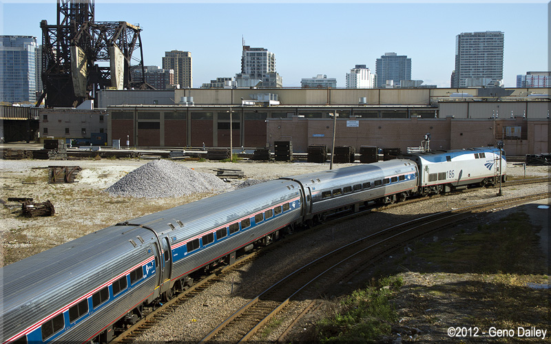 | Shortly after beginning my walk (and eventual bus ride) back to Chicago Union Station, I got a quick photo of Amtrak Lincoln Service Train #302 being turned for servicing. |