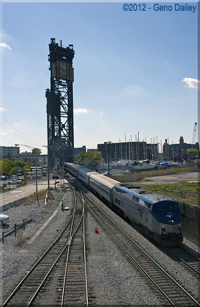 | LEFT: Amtrak Train #365 - The Blue Water crossing the Ex-Pennsylvania Railroad and Gulf, Mobile & Ohio Railroad lift bridge at 21st Street. RIGHT: A wide-angle view of the same train showing the full lift bridge structure. The train had P42DC #176 leading. Special Thanks to Trainorders.com for help in identifying the above pictured train. |