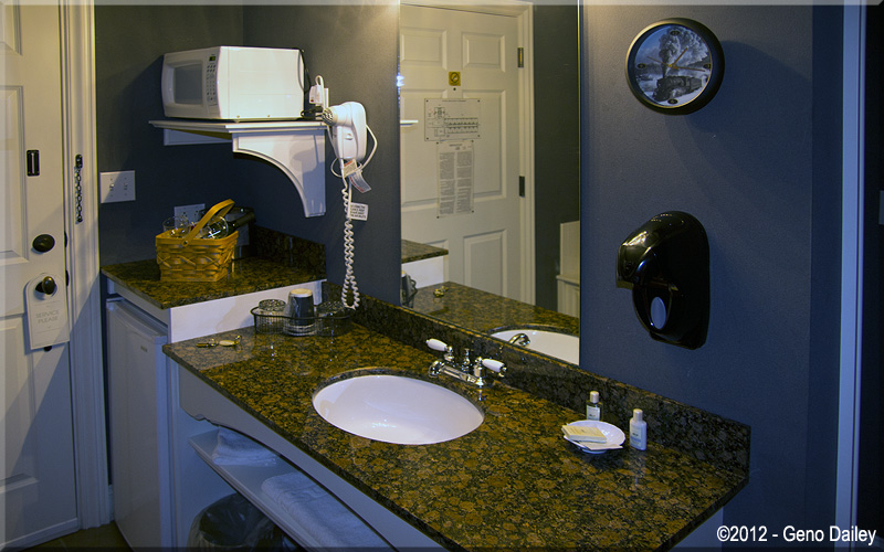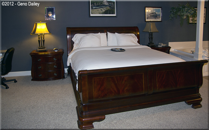 As I said before, the room I stayed in was known as the "Pullman Suite" and featured a king-size bed that had a step box to help you climb up into it. The room also featured a Jacuzzi along with a huge flat-panel TV. The room also has a huge leather couch and a desk in the corner perfect for setting up your laptop to catch up on whatever you're working on. The hotel also has free Wi-Fi internet throughout. In addition to the room amenities, the hotel also features an indoor pool decorated with lots of railroad items! The hall to the regular rooms is also decorated with railroad photos, and memorabilia from conductor uniforms to stock certificates!