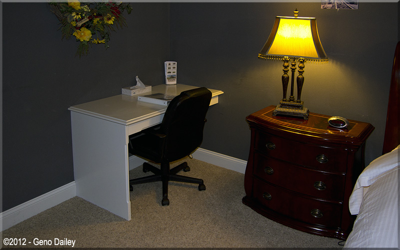 | The room features a desk in the corner and free wireless internet in all rooms. |