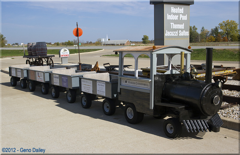 | The "Wabash Cannonball" on display at the Depot Inn's entrance and features advertisements for local businesses in the La Plata area. |