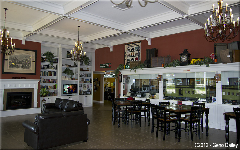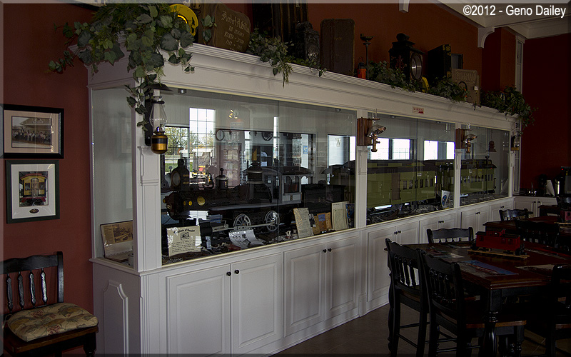 a couple nice leather couches. There is a huge train on display behind the tables with lots of railroad memorabilia on display all over the