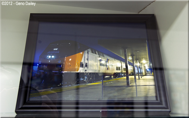 | Normally, I would never take a close-up of another photo, but in this case, I'm breaking my own rule because the photographer who took this photo is also the person who runs this web site, yours truly!!! I'm very honored to have been asked to provide a photo for this display, and am glad to see how it was actually displayed! Special thanks to Bob Cox for contacting me in regards to using this photo! By the way, it's the Phase I-painted P42DC #156 on the head end of the Lake Shore Limited at Buffalo-Depew Station in March 2011! |