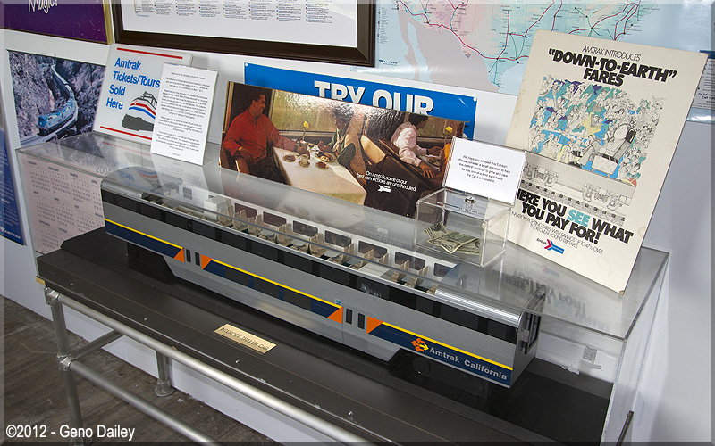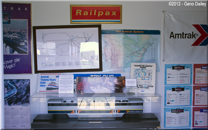 | As soon as you walk into this car, you're greeted with a model of an Amtrak California coach along with a sign on the wall that shows what Amtrak "almost" got named before it was to be called Amtrak, "Railpax", I think Amtrak has a nicer ring to it! |