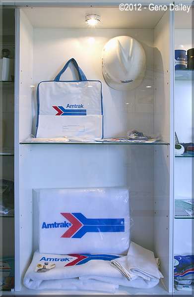 | LEFT: Amtrak mugs, a conductor hat, a race car and who knew they sold frisbees at one point??? RIGHT: An Amtrak bag, hard hat, towels and a blanket. You can still buy Amtrak-branded blankets on long-distance trains today in the lounge car. |