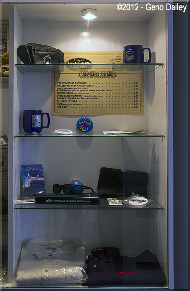 | LEFT: Cups, A tickets/revenue envelope and some Amtrak t-shirts. RIGHT: Acela Express-branded apparel and memorabilia. | |