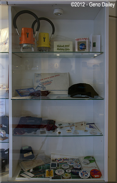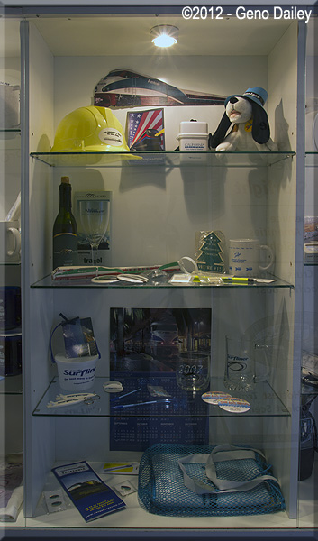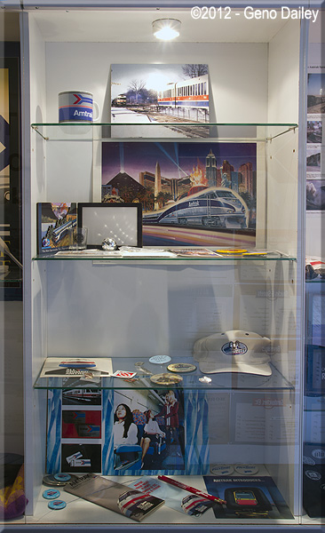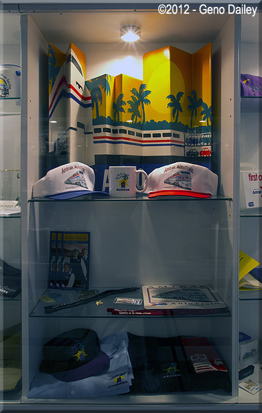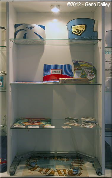 | LEFT: Amtrak Junior Conductor hats as well as some other children's toys. RIGHT: Memorabilia from Amtrak's Capitol Limited along with some HO Scale models of the Material Handling Cars that comprise this museum!!! |