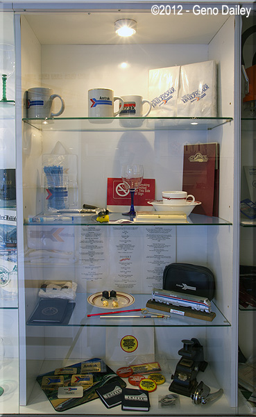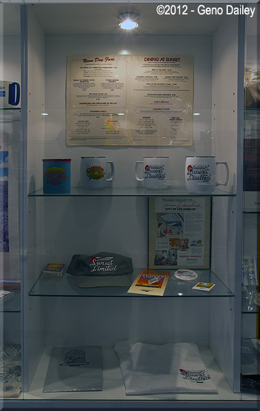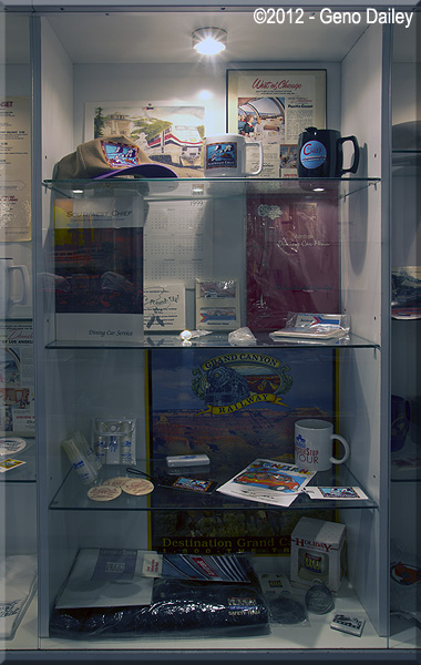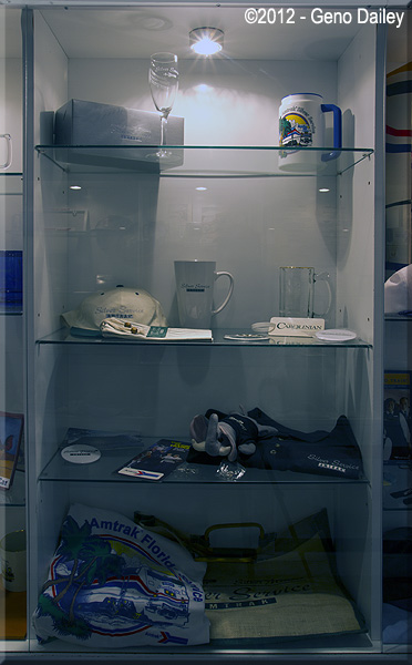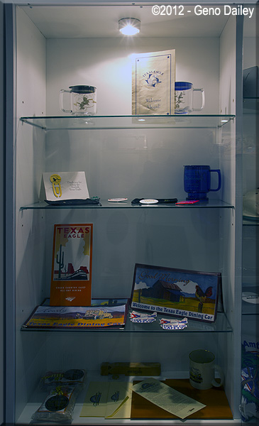 | LEFT: Apparel from Amtrak's Silver Service trains serving Florida as well as memorabilia from the state-sponsored Carolinian. RIGHT: Memorabilia from Amtrak's Texas Eagle including dining car menus. |