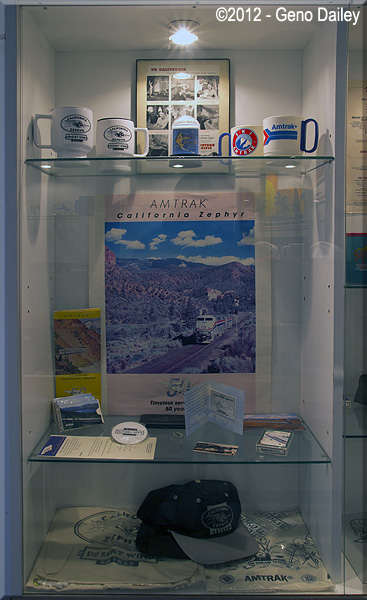 | LEFT: Mugs, a dining car menu and apparel from Amtrak's Sunset Limited. RIGHT: Mugs, apparel and a poster from Amtrak's signature Rocky Mountain adventure, known as the California Zephyr. |