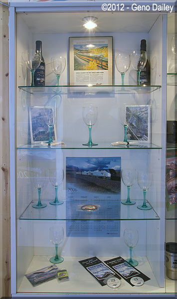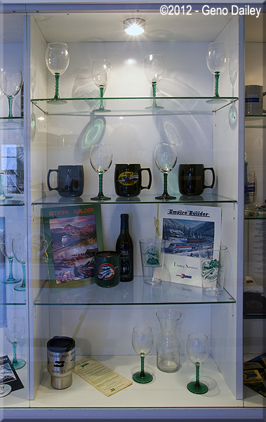 | BOTH: Bottles of wine and wine glasses along with dining car menus and other memorabilia from Amtrak's Empire Builder. | |