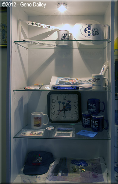 | LEFT: The state-sponsored Amtrak Cascades trains and the Amtrak Pacific Surfliner service depicted in lots of collectibles. RIGHT: Metrolink, Southern California's commuter rail system along with memorabilia from the service that today is now known as Pacific Surfliner, Amtrak's San Diegans. |