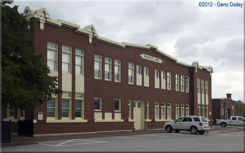 | A streetside view of the station building. I'm sure when the Super Chief came through Marceline, there were no SUV's!!! |