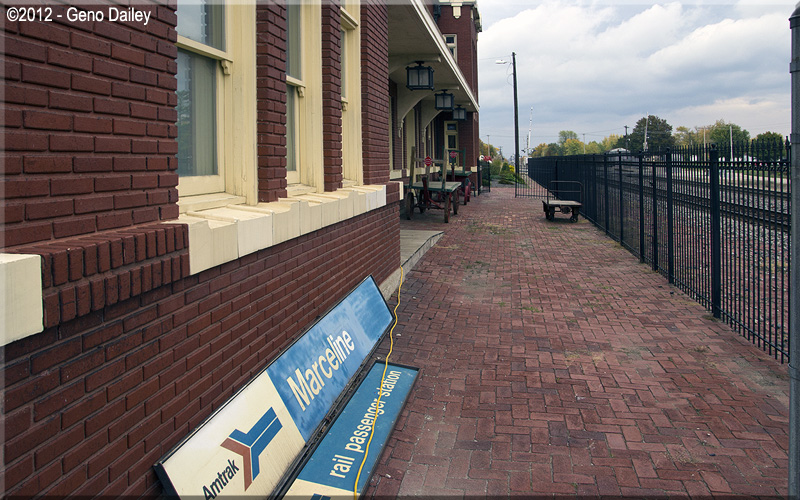 | A wide-angle view of the platform and proof this was at one time, an Amtrak Station! |