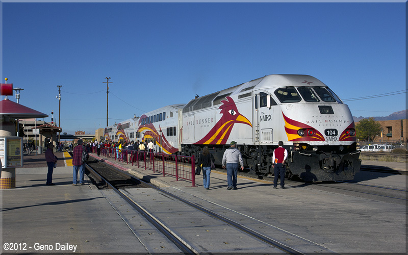 | A New Mexico Rail Runner Express train at Albuquerque with MP36PH-3C #104 for power. |