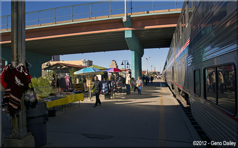 Local Native Americans sell their arts and crafts on the platform at Albuquerque Station. This tradition dates back to the