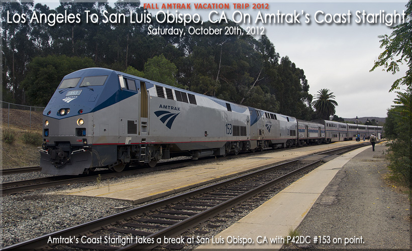 After a very nice conversation with the Amtrak Rep, I walked back to my sleeping car to have a Diet Pepsi then I headed into the Pacific Parlour Car to take in the foggy view of the ocean. I now had a swivel chair to sit in for a bit and had a nice conversation with a passenger from Ireland who with his wife were visiting the U.S.! One thing that Amtrak has truly gotten right in this car in addition to the wireless internet would have to be the smooth jazz music playing in the car (I am a DJ remember?), this adds very nicely to the relaxed atmosphere of this car. There were several passengers on this train that were part of the "America By Rail" tour group that I rode with on the Southwest Chief! They were all riding to Portland, OR to catch the Empire Builder back to Chicago! As we continued passing by lots more mountains and lots of farmland, I just took it all in! Part of one of those big green fields of produce will no doubt end up in my salad someday! An announcement was made by the conductor that we had to go into a siding to let southbound Amtrak Pacific Surfliner Train #1790 pass us. What I found out later is that the conductor has to get off the train and hand-throw the switch to facilitate this! When all was said and done, we go onto the siding, the train passed us and the conductor had to throw the switch back then do the same thing on the other end of the siding! This would explain why once we got onto the siding, we moved then stopped again. Things were uneventful the rest of the way to San Luis Obispo which was the next stop and my stop on this train. At 3:40pm, we arrived at San Luis Obispo which was also a smoking break as well as a crew change point for the train. An announcement was made that the engineer and conductors who brought this train to SLO from LA would be getting off and new Conductors would take the train to Sacramento and a new engineer would take the train to San Jose. The sleeper attendant in my car offered to watch by bags while I ran up to the head end to get more pictures, my thanks to him! Once the train departed, I got a few more photos then headed inside the station, grabbed a Diet Pepsi out of the vending machine and called a local taxi to bring me to my hotel, the Holiday Inn Express in San Luis Obispo!