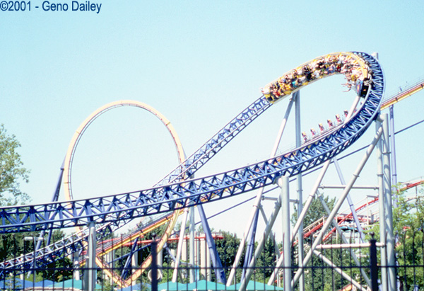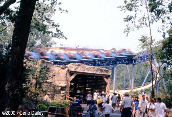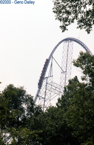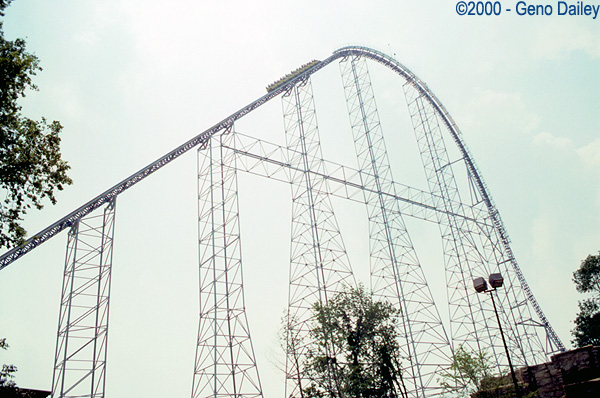 | Heading over one of the two middle hills, the train is at a height of 182 feet, talk about serious air time!!! |